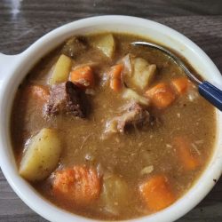 Beef stew with roasted garlic and caramelized onions