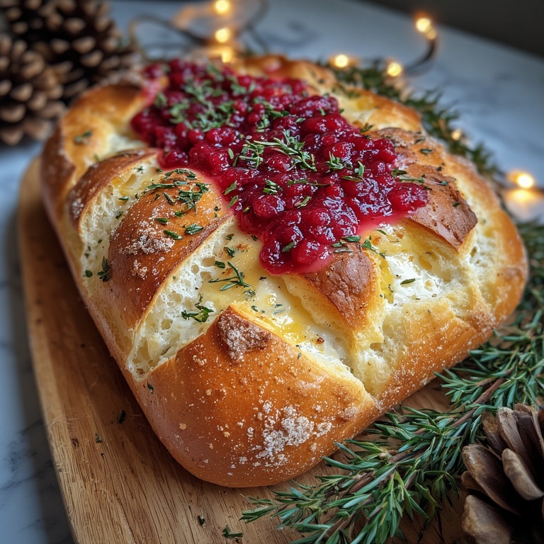 This recipe combines the creamy, luxurious melt of Brie cheese with the tart, festive burst of cranberry sauce, all baked inside a crispy, warm loaf of bread. Finished with a sprinkle of fresh thyme, itβs a beautiful, aromatic centerpiece for any gathering. Plus, who doesn’t love a good pull-apart dish? π₯β